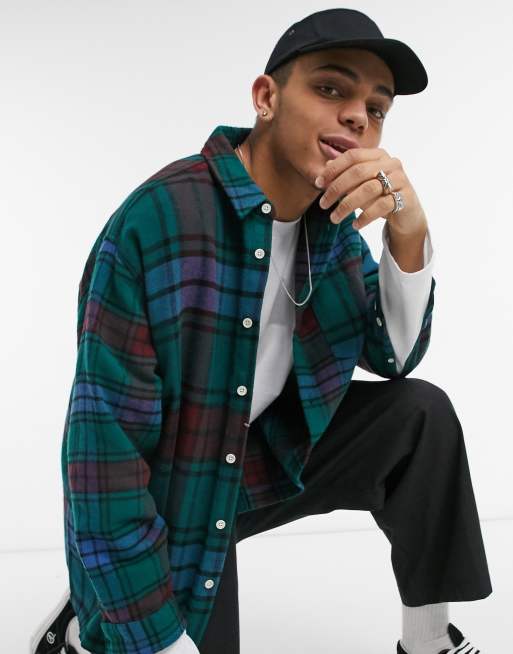 Asos Design Super Oversized Brushed Flannel Half And Half Teal Check Shirt Asos
